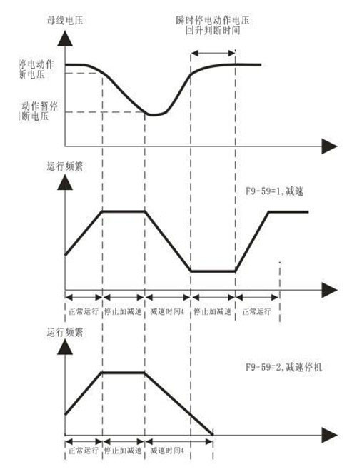 6.1此功能只在停電瞬間變頻器不會故障停機,而是降低輸出頻率,通過負載回饋能量,補充電壓降低,以維持變頻器短時間內繼續工作。